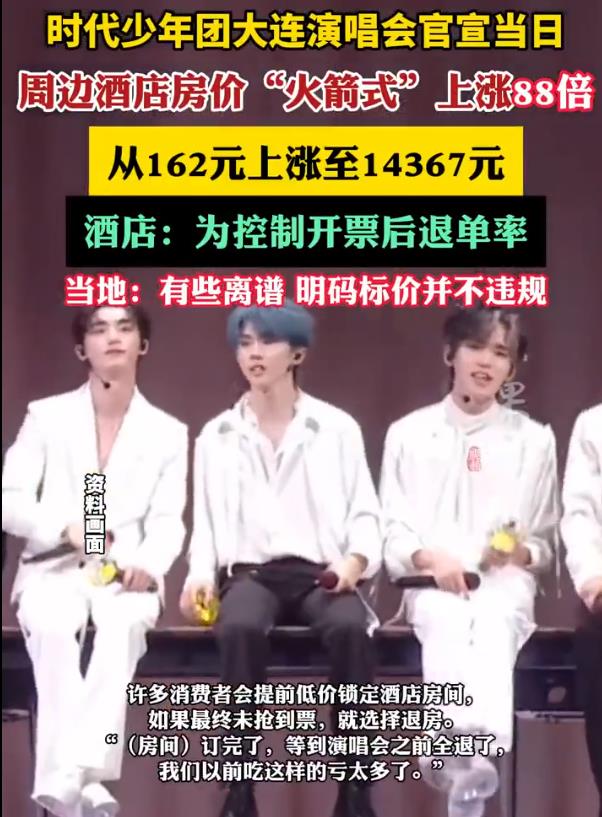 7月1日,一則關于時代少年團大連演唱會的消息直接讓當地酒店價格“原地起飛”!有網友爆料,演唱會舉辦地附近的蝸牛酒店式公寓價格瘋狂暴漲,奶油風大床房從111元飆到5570元,漲幅50倍;休閑麻將房更夸張,從162元直接沖到14367元,漲幅高達88倍!網友驚呼:“這價格是住酒店還是買演唱會VIP席位?”