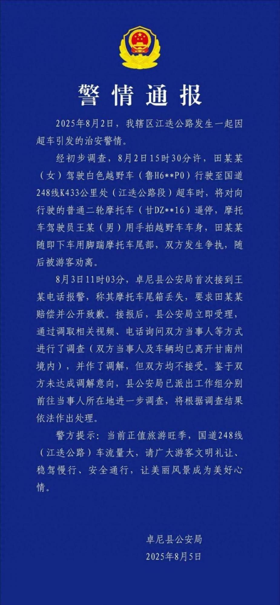 8月5日,甘肅省甘南藏族自治州卓尼縣公安局對一起“因超車引發的治安警情”發布了通報:通過調取相關視頻、電話詢問雙方當事人等方式進行了調查(雙方當事人及車輛均已離開甘南州境內),并作了調解,但雙方均不接受。