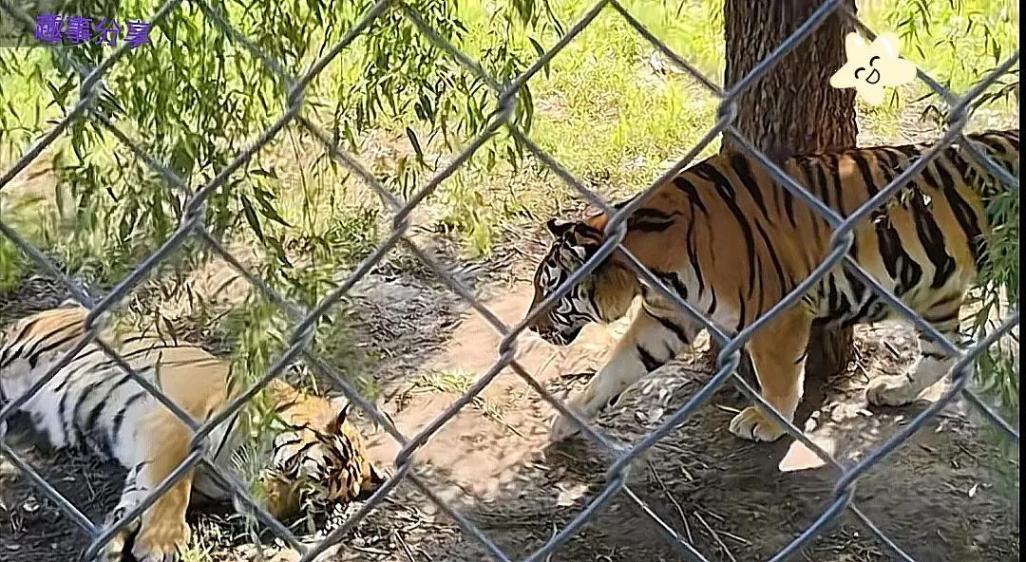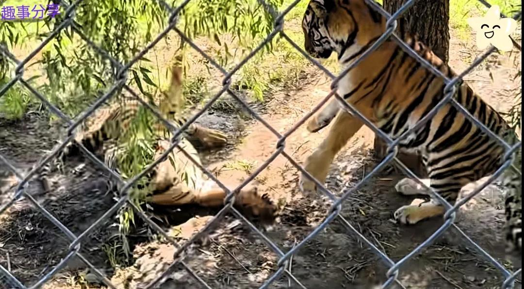 就在靠近同伴的瞬間,這只老虎猛地發(fā)出一聲低沉的吼聲,還猛地?fù)淞艘幌隆T驹谛菹⒌耐楸粐樀脺喩硪患れ`,瞬間跳了起來,警惕地看向四周,發(fā)現(xiàn)是同伴的惡作劇后,不滿地吼了幾聲。而搞惡作劇的老虎呢,卻像個(gè)得逞的孩子,得意洋洋地晃著腦袋,仿佛在說:“大家票不白買嗷,這精彩表演夠你們回味一陣?yán)玻?rdquo;