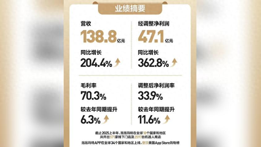 8月19日下午,泡泡瑪特國際集團(tuán)發(fā)布2025年半年報,財報顯示,上半年泡泡瑪特營收138.8億元(人民幣,下同),同比增長204.4%,經(jīng)調(diào)整凈利潤47.1億元,同比增長362.8%。半年?duì)I收突破百億,凈利潤超2024全年。上半年泡泡瑪特旗下諸多IP收獲超高人氣,LABUBU所在的THE MONSTERS營收48.1億元,占比34.7%;MOLLY、SKULLPANDA、CRYBABY和DIMOO營收均突破10億元;13大藝術(shù)家IP收入破億。上半年,毛絨品類營收61.4億元,收入占比首次超過手辦。