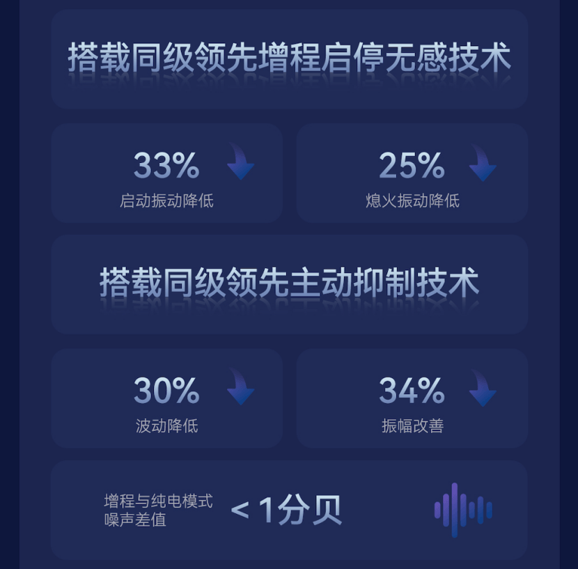 性能表現(xiàn)方面,該車系統(tǒng)綜合功率達(dá)200kW,峰值扭矩360N·m,滿電狀態(tài)下零百加速6.5秒,饋電狀態(tài)下仍能保持7.6秒的加速能力。通過同級(jí)領(lǐng)先的增程啟停無感技術(shù),啟動(dòng)振動(dòng)降低33%,熄火振動(dòng)減少25%,配合主動(dòng)抑制技術(shù)使振動(dòng)波動(dòng)降低30%,振幅改善34%。增程模式與純電模式的噪聲差值控制在1分貝以內(nèi),實(shí)現(xiàn)低波動(dòng)、低振幅、無抖動(dòng)的平順駕駛體驗(yàn)