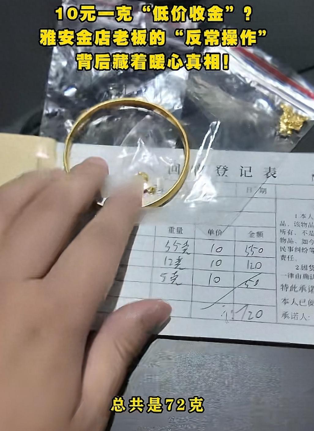 別人撿了東西,再歸還主人叫“拾金不昧”,但金店老板卻是“收金還主”。收了黃金之后又還給了主人。近日四川雅安天全縣一家金店老板做了一筆的買賣,10元1克收了小孩72克黃金之后,轉頭發視頻說讓孩子家長來領取。