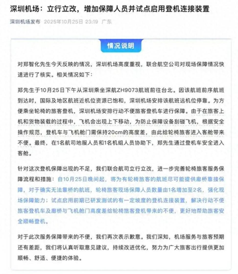 事件發(fā)酵后,深圳機(jī)場官方微博于當(dāng)日傍晚發(fā)布聲明,向鄭智化致歉,并表示已啟動(dòng)核查。25日深夜11時(shí)許,深圳機(jī)場微信公號發(fā)文表示,機(jī)場聯(lián)合航司立行立改,進(jìn)一步完善輪椅旅客服務(wù)保障流程和措施:自10月25日晚間起,將為有輪椅旅客的航班盡可能提供廊橋靠接保障,對于確實(shí)無法靠橋的航班,輪椅旅客現(xiàn)場保障人員數(shù)量由1名增加至2名,強(qiáng)化現(xiàn)場保障能力。